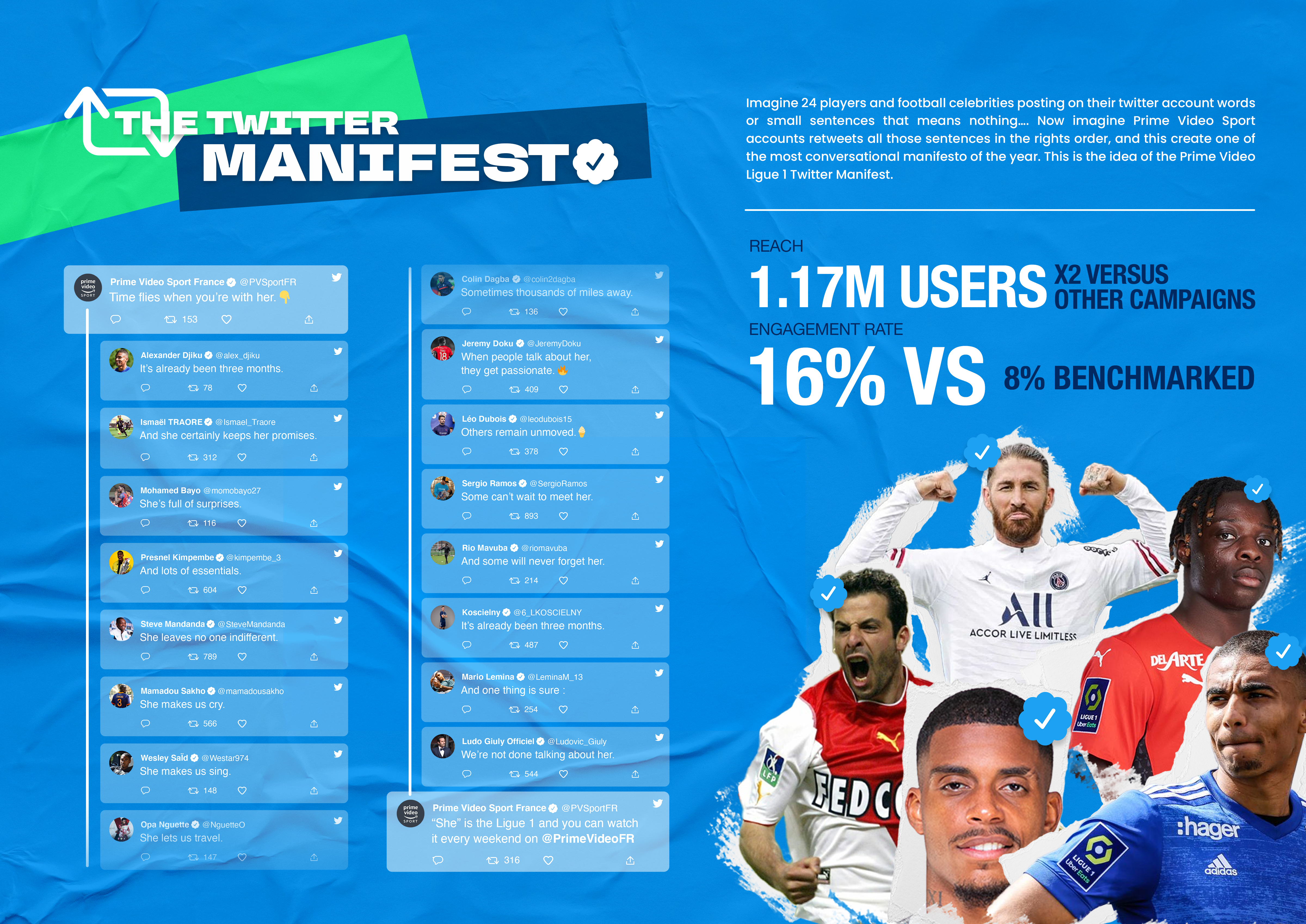To promote the broadcasting of the Ligue 1 soccer on Prime Video, we asked the star players from each club in the league to post separate mysterious tweets on their Twitter accounts. All these tweets, when put together, formed a message with a whole new meaning. At the end of the campaign Prime Video Sport retweeted the messages in the right order to reveal the campaign’s message that promoted the Ligue 1.