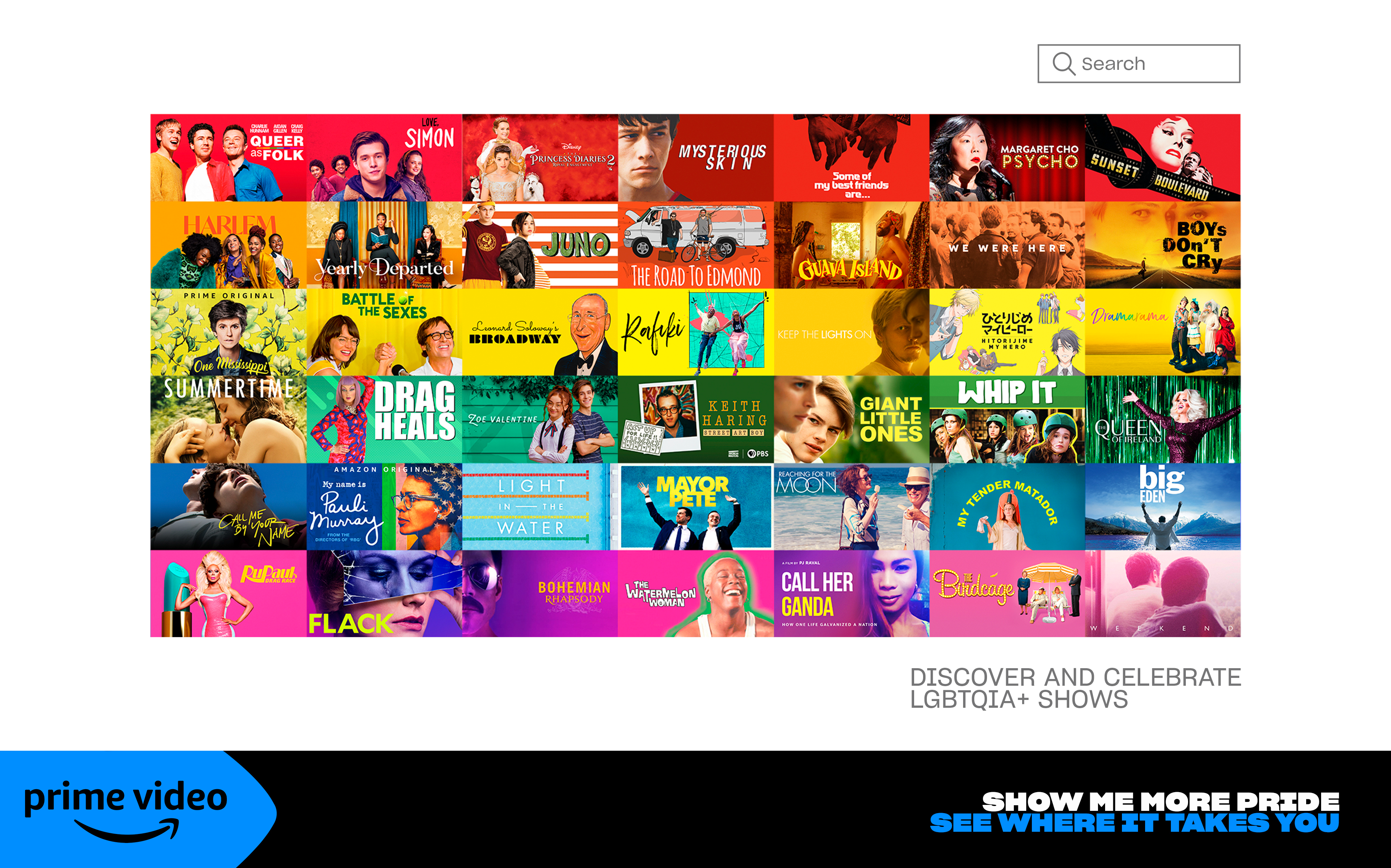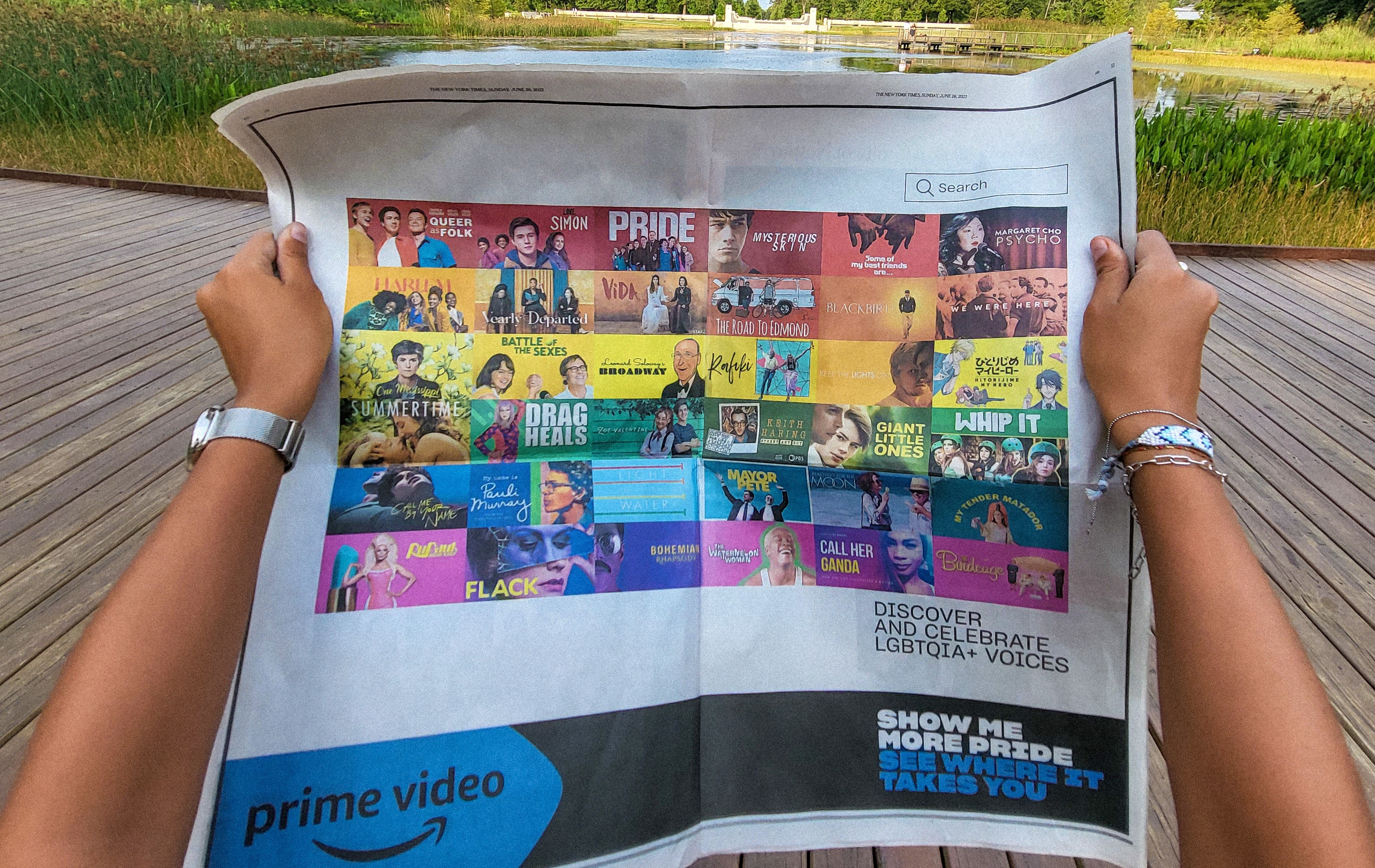À l’occasion de la Pride March de New York le 26 Juin 2022, Prime Video a trié les shows LGBTQ+ de son catalogue pour reformer le rainbow flag à la manière du design de son interface.Une double page publiée dans le très célèbre New York Times.